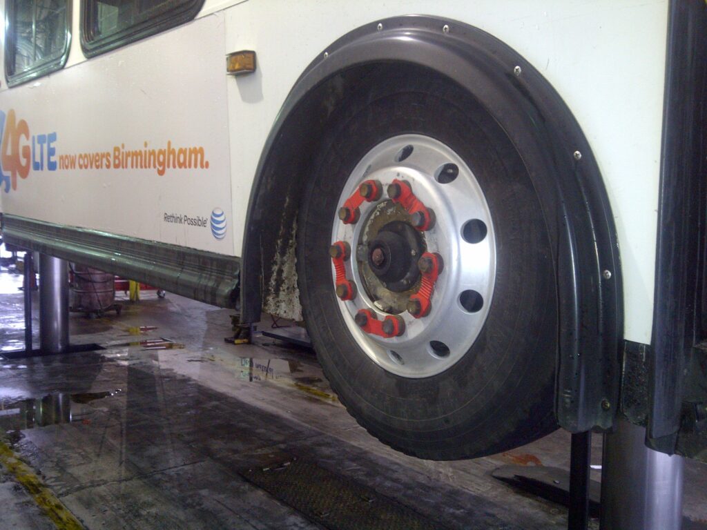 Several different sizes apply to the transit industry with a larger 4 1/8″ (104.5 mm) stud center-to-center spacing with 1 5/16″ (33 mm) nuts specifically developed for city transit buses, and smaller 2.5″ (63.5 mm) stud center-to-center spacing with 1″ (25 mm) nuts for wheel-trans buses.